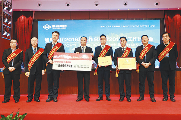 編者按:2016年1月24日,通威集團2016年工作總結暨2017年工作計劃會議隆重召開。作為會議的重要議程,會議隆重嘉獎了2016年度先進典型公司和優秀團隊。回首2016,通威集團、股份各板塊、各公司捷報頻傳,成績斐然。生產、經營、管理、企業文化等方面齊頭并進,取得了可圈可點的成果。在當前宏觀經濟形勢下,通威以驕人的業績,不斷刷新行業紀錄,不斷強化核心競爭力,每一步都走得踏實而穩健,都創造了輝煌的歷史。優異成績的背后,不僅有劉主席的高瞻遠矚與戰略指導,更有全體員工的齊心協力、勤勉奮斗。本次的年度表彰,進一步激勵了團隊,堅定了信心!為了我們引以為豪的事業,大家將帶著責任感、使命感與光榮感,激情滿懷,昂首闊步,與通威共同前進!