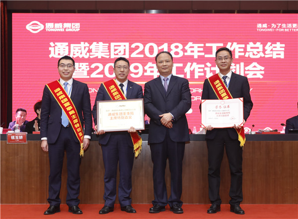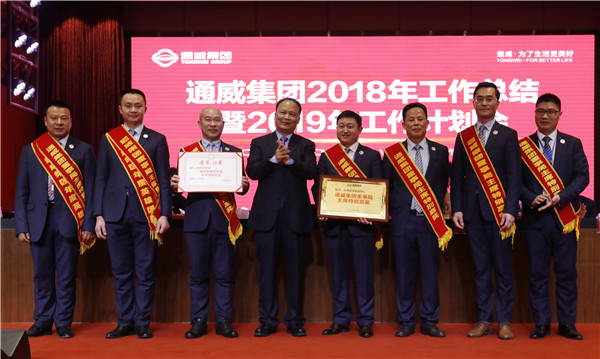 2018年,在貿易紛爭、經濟下行、行業受到沖擊、市場競爭日趨激烈的情況下,全體通威人深入貫徹劉主席“聚勢聚焦、揚長砍短”八字方針,在挑戰與機遇中主動出擊、逆勢而上、直面市場競爭,高效整合資源要素,創新發展,重點突破,精誠團結,取得了輝煌成績,贏得了行業內外的廣泛尊重,向打造“三個世界級龍頭”的宏偉目標又邁進了一大步!在通威集團2018年工作總結暨2019年工作計劃會議上,隆重揭曉了通威集團董事局主席特別嘉獎。通威(海南)水產食品有限公司飼料分公司、通威股份有限公司南昌分公司、通威股份原料體系、集團品牌傳播體系、通威光伏終端管理團隊、通威太陽能管理團隊、永祥股份管理團隊榮耀加冕,贏得在場全體同仁的熱烈掌聲。