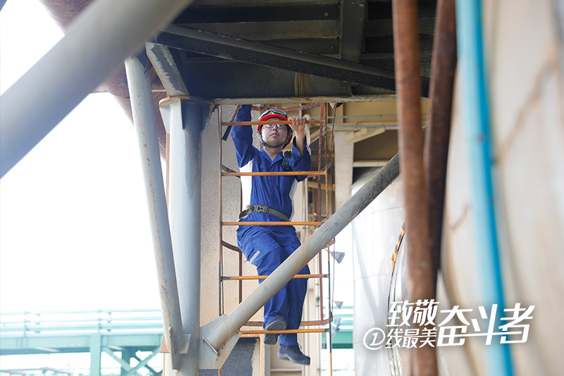裝置區(qū)鋼架樓梯,幅度高、梯級間隔大。我頂著烈日,跟著爬了三層,已經(jīng)有些氣喘吁吁。當(dāng)陶勛貴告訴我,如果有裝置出現(xiàn)問題,他們背著三十斤應(yīng)急處置裝備也必須在2分鐘從1層跑到5層時,我有些驚訝:“可能嗎?”