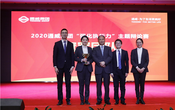本報訊(唐勝/文)2020年1229日,以“聚焦執行文化  鍛造執行鐵軍”為主題的2020通威集團“強化執行力”主題辯論賽暨頒獎盛典在通威國際中心隆重舉行。十一屆全國政協常委、全國人大代表、通威集團董事局劉漢元主席,集團禚玉嬌總裁,股份總裁郭異忠 ,集團副總裁胡榮柱,集團企業文化專項工作小組執行組長、集團副總裁黃其剛,股份監事會主席鄧三,集團財務總監肖吉華,股份金融總監、通威新能源公司執行董事兼總經理邱艾松,股份信息總監周勇,集團工會主席、集團企業文化專項工作小組執行組長、通威大學執行副校長張紅纓,四川大學公共管理學院教授陳麗,四川省委省直機關黨校副教授、博士吉媛等領導嘉賓出席。四川電視臺知名主持人楊林擔當大會主持。