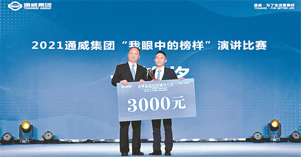 劉漢元主席為“我眼中的榜樣”演講比賽一等獎獲得者通威太陽能梅曉東頒獎