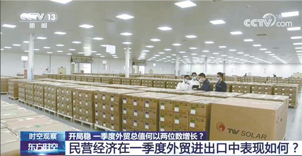 本次央視《新聞聯播》和《東方時空》欄目在專題報道中特別聚焦了光伏產業和民營經濟的發展,作為代表企業,通威太陽能獲得關注。報道指出,近期,一批價值近千萬元的光伏電池經中歐班列運抵法國,這是通威太陽能今年出口歐盟的第五批光伏電池。今年一季度四川省民營企業進出口同比增長一倍,對法國、意大利等國出口增速60%以上,其中,作為光伏行業領先企業,通威太陽能今年已經接到超4億元的出口訂單。