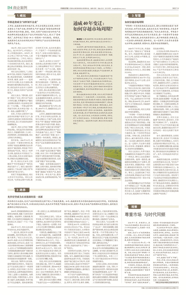 提及通威股份的成長邏輯,劉漢元主席對《中國經營報》記者表示:“一是技術進步,二是社會需求。起初從渠道金屬網箱式流水養魚技術做起,我們越來越肯定地認為,農業的技術進步,需要工業化的推動。通威希望和農民協同發展,助力中國的傳統農業向現代農業逐漸過渡。進入光伏行業后,公司在技術上的研發,同樣支撐了公司的行業地位。不同的發展時期,有著不同的社會發展需求。通威的兩次選擇,都是當時社會最需要的。”