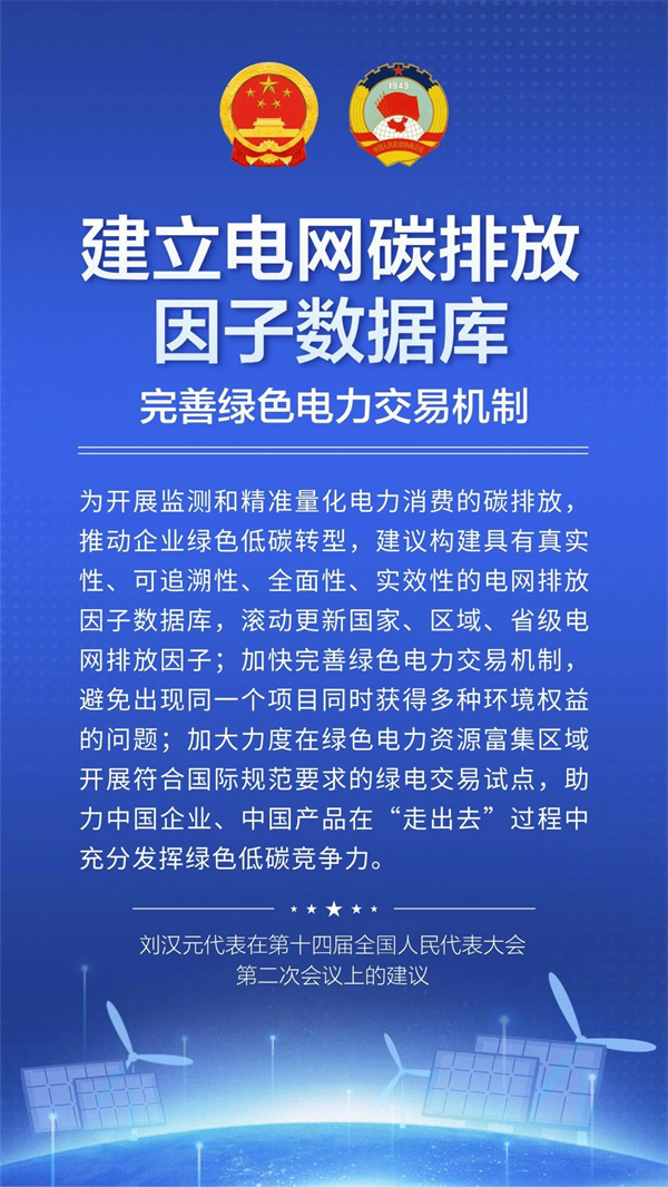 “建議加大力度在綠色電力資源富集區域開展符合國際規范要求的綠電交易試點,充分發揮綠色電力在降低企業或產品碳排放方面的作用,助力中國企業、中國產品在‘走出去’過程中充分發揮綠色低碳競爭力。”劉漢元代表說。
