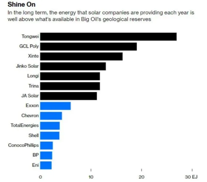 而排在最大的石油公司埃克森前面的,無一例外全是中國的光伏公司:通威股份、協鑫科技、新特能源、晶科能源、隆基綠能、天合光能、晶澳科技。