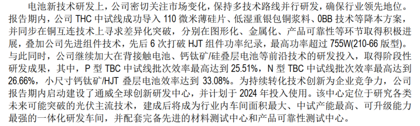 在最新的2023年年報(bào)中,可以看到通威在產(chǎn)業(yè)和資本市場(chǎng)熱度最高的電池新技術(shù)全面布局,除TOPCon、HJT路線外,通威股份在全背接觸電池、鈣鈦礦/硅疊層電池等前沿技術(shù)方面的研發(fā)方面均獲得積極進(jìn)展,有望在下一次技術(shù)迭代中占據(jù)領(lǐng)先位置。而且各項(xiàng)電池新技術(shù)效率數(shù)據(jù)都詳盡披露,彰顯公司的技術(shù)自信。