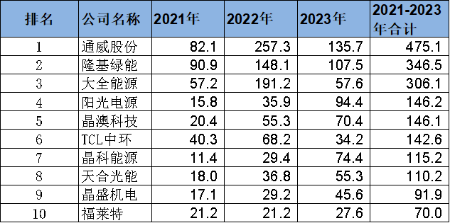 雖然2023年光伏產(chǎn)業(yè)鏈價(jià)格大幅調(diào)整,競(jìng)爭(zhēng)加劇,但通威股份仍然顯示出強(qiáng)大的抗風(fēng)險(xiǎn)能力。繼2022年之后,通威股份2023年盈利135.7億元,繼續(xù)蟬聯(lián)光伏行業(yè)最賺錢企業(yè)。如果我們將過去三年的凈利潤(rùn)進(jìn)行匯總,通威股份的凈利潤(rùn)合計(jì)為475億元,在國內(nèi)光伏企業(yè)中位居第一并大幅領(lǐng)先。