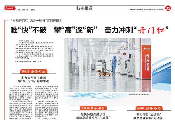 2月1日,《眉山日報》發布一篇題為“唯‘快’不破、攀‘高’逐‘新’,奮力沖刺‘開門紅’”的專題報道,聚焦通威太陽能眉山基地高質量發展與奮力沖刺“開門紅”。