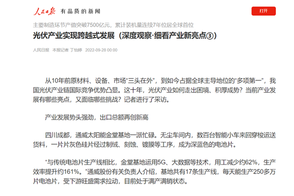 928日,《人民日報發表題為光伏產業實現跨越式發展”的文章,在報道中聚焦及點贊通威太陽能金堂基地智能制造水平及5G技術的創新應用