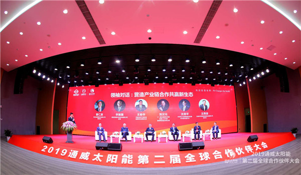 3月26日,2019通威太陽能第二屆全球合作伙伴大會(huì)在通威太陽能(成都)有限公司隆重舉行。成都市政協(xié)副主席、雙流區(qū)委書記韓軼,原國務(wù)院參事、中國可再生能源學(xué)會(huì)第七屆、第八屆理事長石定寰,中國光伏行業(yè)協(xié)會(huì)副理事長兼秘書長王勃華,隆基綠能科技股份有限公司總裁李振國,中環(huán)電子信息集團(tuán)總經(jīng)理、中環(huán)股份董事長沈浩平,陽光電源股份有限公司董事長曹仁賢,無錫先導(dǎo)智能裝備股份有限公司董事長王燕清,江蘇環(huán)太集團(tuán)董事長王祿寶,雙流區(qū)政府副區(qū)長曾虎,西航港經(jīng)濟(jì)開發(fā)區(qū)管委會(huì)黨工委書記、管委會(huì)主任馬駿等領(lǐng)導(dǎo)嘉賓出席。十一屆全國政協(xié)常委、全國人大代表、通威集團(tuán)董事局主席劉漢元,通威集團(tuán)總裁禚玉嬌,通威太陽能董事長謝毅,通威股份光伏事業(yè)部總裁陳星宇,通威股份監(jiān)事會(huì)主席鄧三等通威高管出席,中央電視臺(tái)知名主持人劉棟棟擔(dān)任主持人,近百家全球頂級(jí)光伏企業(yè)精英共300余人齊聚蓉城,共同探討行業(yè)發(fā)展趨勢(shì),共話光伏發(fā)展未來。