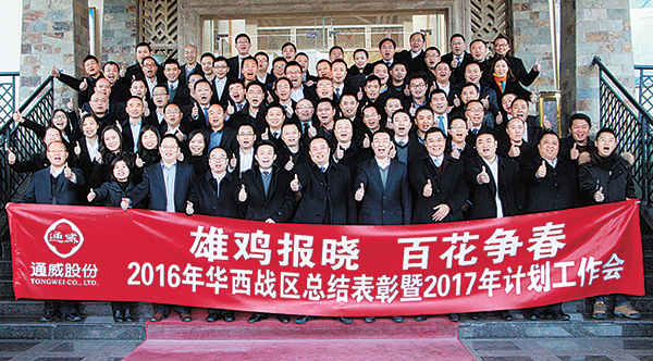 本報訊(通訊員 戴書?。?月11-13日,以“雄雞報曉 百花爭春” 為主題的華西戰區2016年總結表彰暨2017年計劃工作會順利召開。通威股份郭異忠總裁,通威股份副總裁兼華西戰區總裁宋剛杰,通威股份財務總監袁仕華,通威大學執行副校長張紅纓,通威股份市場營銷部部長陳濤出席會議。華西戰區各公司總經理、各職能總監、市場部經理及財務部經理等80余人參加會議。