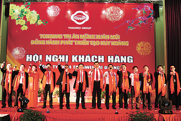 當晚,海陽通威2017年新春聯(lián)歡會在具有越南特色的團春歌和獅子舞的火辣、熱情、喜慶的舞蹈下拉開序幕。大會同時對2016年度優(yōu)秀員工、優(yōu)秀部門和優(yōu)秀代理進行了表彰及頒獎。隨后,海陽通威總經(jīng)理許儀作《攜手共進 再創(chuàng)輝煌》的專題報告,總結(jié)海陽通威2016年取得的成績,并部署海陽通威未來的工作規(guī)劃,為表達海陽通威干部團隊的堅定決心,許總帶領(lǐng)海陽通威全體干部團隊上臺做了宣誓承諾。最后,通威股份副總裁兼海外戰(zhàn)區(qū)總裁陳平福作重要講話。陳總首先對全體員工及來賓致以了親切的問候和新年的祝福,感謝大家在過去一年的辛勤努力和辛苦付出,并祝愿大家在新的一年,事業(yè)更上一層樓。整臺晚會氣氛高潮不斷,員工和客戶都踴躍參與,盡享這一刻的歡愉時光。展望全新的2017,大家將攜手并肩,共創(chuàng)新輝煌。