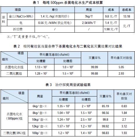 按小型(400L/h)殺菌水機,鹽水濃度7‰,功率1kW;設(shè)備折舊費按平均年限法計。表1顯示,500ppm殺菌電化水生產(chǎn)成本為13.18元/噸,按1.3所述推薦用量計算得:預(yù)防消毒時成本為0.09-0.15元/畝·米,配合治療消毒時成本為0.16-0.2元/畝·米。