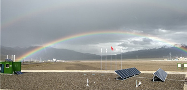 通威集團“青藏綠色驛站”離網(wǎng)光伏發(fā)電系統(tǒng)在彩虹下映照