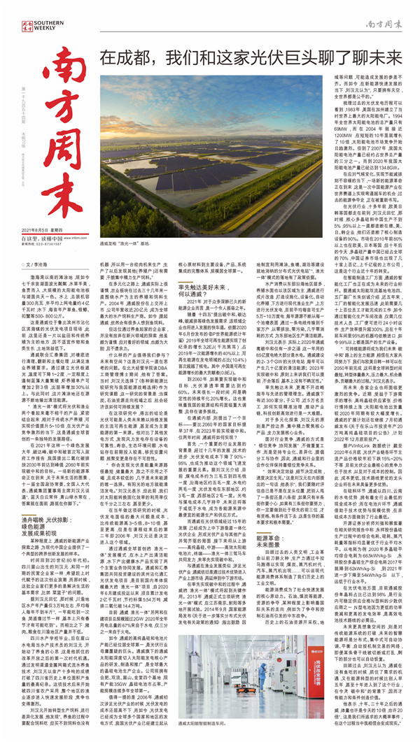 8月5日,最新推出的《南方周末》以《在成都,我們和這家光伏巨頭聊了聊未來》為題,對通威進(jìn)行了整版專題報(bào)道,報(bào)道聚焦“漁光一體”、光伏行業(yè)、智能制造等方面,并專訪了劉漢元主席。