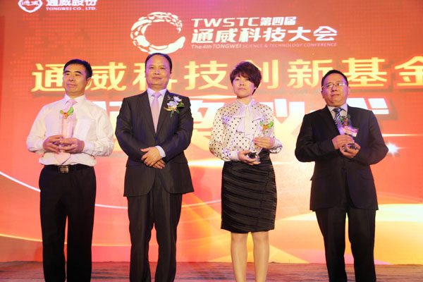 本次大會上,通威股份“通威科技創(chuàng)新基金”頒發(fā)的科技獎勵超過500萬元,表彰了2013年度對行業(yè)、對國家有重要或重大成果貢獻的項目及成果16項,涵蓋了水產(chǎn)、畜禽、動物保健、養(yǎng)殖示范推廣技術、檢測技術等各方面的技術成果,既有通威自主立項的共性技術和前瞻性技術攻關、營養(yǎng)與飼料研究、示范養(yǎng)殖模式推廣、新技術新產(chǎn)品開發(fā)等課題,也有國家和部、省、市重大科技項目。“通威科技創(chuàng)新基金”面向全球表彰農(nóng)牧養(yǎng)殖領域的優(yōu)秀科研成果,并對包括水產(chǎn)養(yǎng)殖業(yè)和畜禽養(yǎng)殖業(yè)在內(nèi)的全行業(yè)科技研究者和成果應用者進行評選推介和資金扶持。大會上,四川農(nóng)業(yè)大學周小秋教授榮獲2013年度“通威科技創(chuàng)新基金特別貢獻獎”,授予獎金100萬元;2013年度榮獲“國家科技進步二等獎”成果的“建鯉健康養(yǎng)殖的系統(tǒng)營養(yǎng)技術研究及其在淡水魚上的應用”,以及2013年度獲得“行業(yè)十大科技進步獎”成果的“池塘365高效健康養(yǎng)殖模式”分別獲得表彰獎勵100萬元。