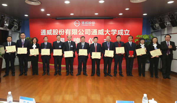 隨后,劉主席、嚴總一同為“通威大學”的成立揭牌剪彩,隨著鮮艷的紅綢緩緩揭起,現(xiàn)場雷鳴般的掌聲詮釋了通威人內心的激動與興奮,這一刻意味著通威人有了自己的成長家園,行業(yè)增添了夢想實現(xiàn)的天地;這一刻揭開了通威人用“培養(yǎng)精英、創(chuàng)造精品”的理念,邁向實現(xiàn)“將軍的搖籃”的偉大愿景。會上,聘任了一批通威大學“首席專家”和“專家級講師”。