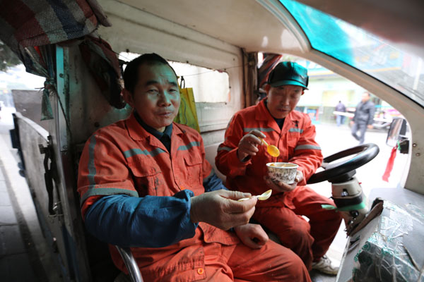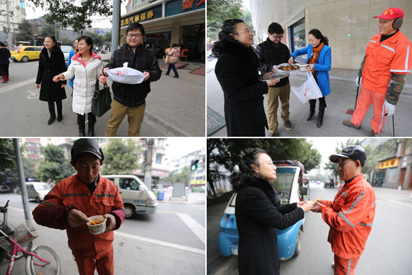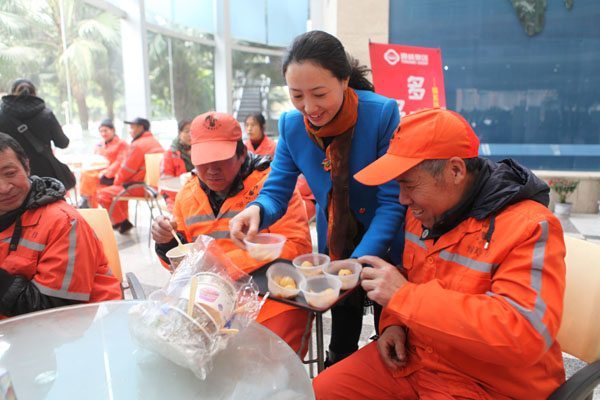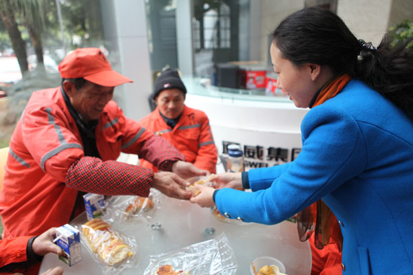 1月13日總部組織員工對環衛工人捐贈棉衣、棉被。1月15日,高新區工會何處長帶領肖家河街道40多位環衛工人到總部,下午2點剛剛從工作崗位上下班還沒有用午餐的環衛工人一坐下,集團工會李主席和工會其他成員為環衛工人送上了面包和溫熱的牛奶,通威食品的同事們忙著為他們煮著魚丸和魚餃,同事們把一碗碗熱氣騰騰魚丸送到每個環衛工人的手上,環衛工人們接過香噴噴的魚丸連聲道謝。第一次享受到別人為他們送上的美食,從他們臉上我們看到了幸福和喜悅。送走40多位環衛工人,集團工會李主席在環衛公司工會曾主席的帶領下將煮熟的魚丸送到了他們正在勞動的崗位上,一位環衛工人端著這熱氣騰騰的魚丸,激動的說“通威真是個不錯的公司,我們吃著這碗魚丸心理真的很溫暖”。同時,通威集團工會和高新區工會共同為肖家河街道200多名環衛工人每人贈送兩袋通威海南純生魚丸作為對環衛工人新春的慰問,希望他們能在社會各界的關懷下度過一個溫暖、祥和的春節。