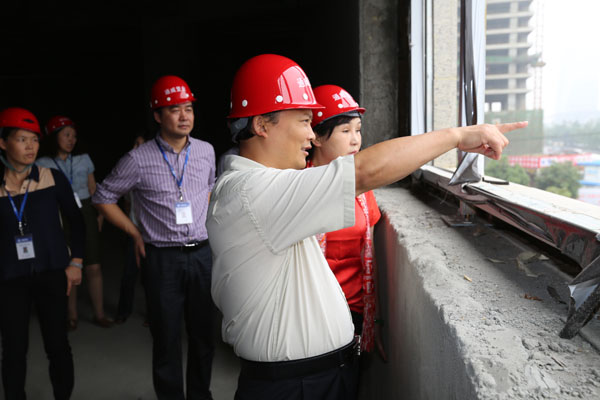 當天下午兩點,劉主席、管董事長等一行準時來到項目部,一下車即走進了正在施工作業的通威國際中心項目工地。中秋、國慶節將至,大家的工作生活安排得怎么樣?劉主席與管董事長十分惦念。踏著泥濘的小道,劉主席、管董事長一行與工友們親切握手、親熱談心,把代表集團總部的關心與問候帶給了在場的每一位員工。