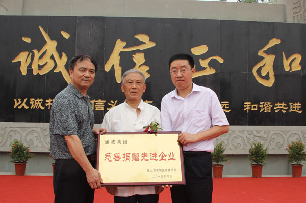 剪彩儀式上,眉山市東坡區(qū)黨委副書(shū)記嚴(yán)明宇向通威集團(tuán)授予“慈善捐贈(zèng)先進(jìn)企業(yè)”的榮譽(yù)牌匾。陳總代表劉漢元主席對(duì)文化廣場(chǎng)的竣工表示祝賀,他介紹,通威作為發(fā)源于眉山市永壽鎮(zhèn)的企業(yè),劉主席作為永壽鎮(zhèn)發(fā)展起來(lái)的著名企業(yè)家,為能積極支持和參與家鄉(xiāng)建設(shè)感到高興,希望永壽鎮(zhèn)用好捐贈(zèng)資金,全力推動(dòng)相關(guān)項(xiàng)目建設(shè),真正將永壽通威文化廣場(chǎng)施工好、建設(shè)好、使用好、管理好,真正為家鄉(xiāng)父老提供一個(gè)休閑健身的一流場(chǎng)所。東坡區(qū)、永壽鎮(zhèn)黨政領(lǐng)導(dǎo)對(duì)劉漢元主席及通威集團(tuán)對(duì)家鄉(xiāng)及眉山市經(jīng)濟(jì)、文化和社會(huì)建設(shè)等各方面長(zhǎng)期給予的寶貴支持表達(dá)了感謝,并表示將切實(shí)落實(shí)好捐贈(zèng)資金,加強(qiáng)永壽鎮(zhèn)文化建設(shè),加快興建文化基礎(chǔ)設(shè)施。
