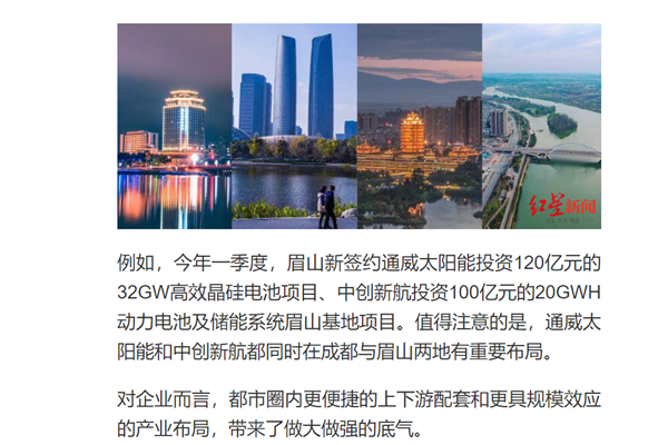 報道指出,都市圈內,既有成都市地理位置、科研院所、知名高校、營商環境等突出資源優勢,又有德眉資土地資源、特色產業比較優勢。強強聯合,便有了都市圈“研發+制造”的合作模式,讓建圈強鏈行動在都市圈內走深走實。例如,今年一季度,眉山新簽約通威太陽能投資120億元的32GW高效晶硅電池項目。值得注意的是,通威太陽能在成都與眉山兩地有重要布局。