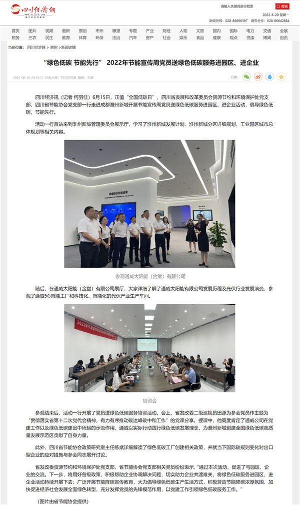 6月17日,中國新聞網(wǎng)、四川經(jīng)濟(jì)網(wǎng)等媒體以“2022年節(jié)能宣傳周黨員送綠色低碳服務(wù)走進(jìn)成都淮州新城”為題,聚焦通威太陽能金堂基地節(jié)能宣傳周活動(dòng)。