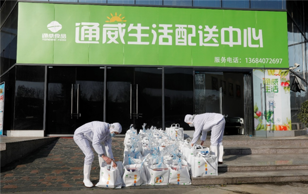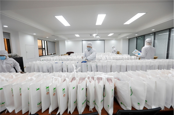 通威食品工作人員將禮包裝袋,準備為“白衣天使”送貨到家