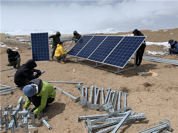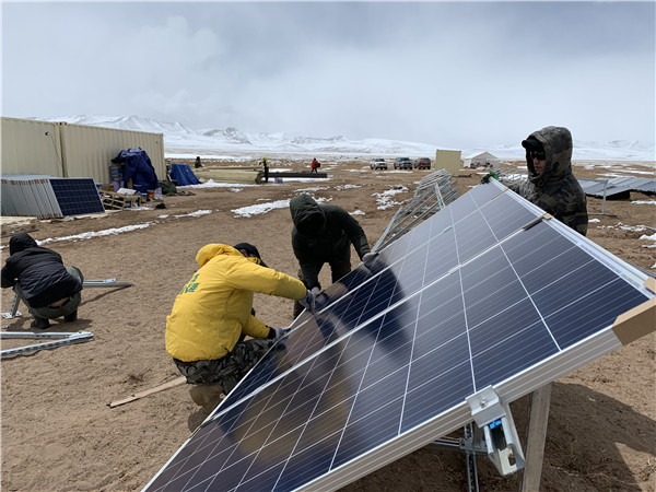 為了順利推進高海拔下的建設(shè)工作,通威新能源負責(zé)本次項目建設(shè)的工程師3月25日就抵達了格爾木,為安裝光伏系統(tǒng)作好全面準(zhǔn)備;26日,光伏組件從通威太陽能(合肥)有限公司成功發(fā)車;31日,參與項目建設(shè)的工程師及志愿者率先抵達班德湖野生動物觀測站,對現(xiàn)場施工情況進行勘察。然而,由于高原地區(qū)持續(xù)大雪,進入營地的道路連續(xù)三天封閉,本次捐贈的光伏系統(tǒng)被堵在半路,導(dǎo)致安裝工作延遲。在組件抵達班德湖觀測站后,建設(shè)人員迅速行動、爭分奪秒,不顧缺氧和當(dāng)?shù)氐膰篮畾夂颍瑑H用1天時間就完成班德湖野生動物觀測站光伏發(fā)電系統(tǒng)的全部安裝調(diào)試工作,保證了觀測站的建設(shè)進度。