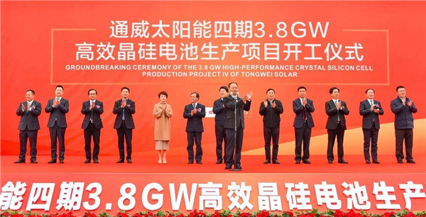 謝董表示,成績的背后離不開市、區各級黨委、政府領導的關懷和幫助。政企之間、同心同向,更成為當前“親清”新型政商關系的典范。今天,通威將再新增投資20億元,正式啟動第四期工程,計劃今年內投產。今年底,通威電池總產能將超過20GW,將連續3年成為全球產能規模和出貨量最大的太陽能電池企業,全球市場占有率有望達到15%。
