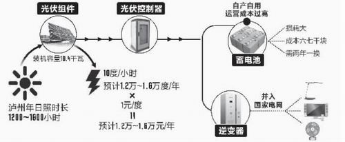 王坤介紹,氣象部門披露的數(shù)據(jù)顯示,多年以來,瀘州的年日照時長可達1200至1600小時。“根據(jù)我目前的裝機容量。太陽每照耀一小時,即可發(fā)電10度。一年下來,可發(fā)電1.2萬度至1.6萬度。國家電網(wǎng)目前收購價為1元/度,這也意味著,單靠樓頂這個發(fā)電站,保守估計,每年可實現(xiàn)收入1.2萬元。建設這個小型發(fā)電項目,投入為7萬余元。7年即可收回成本。由于使用年限可達20至25年,剩下的時間,則為純利潤。”